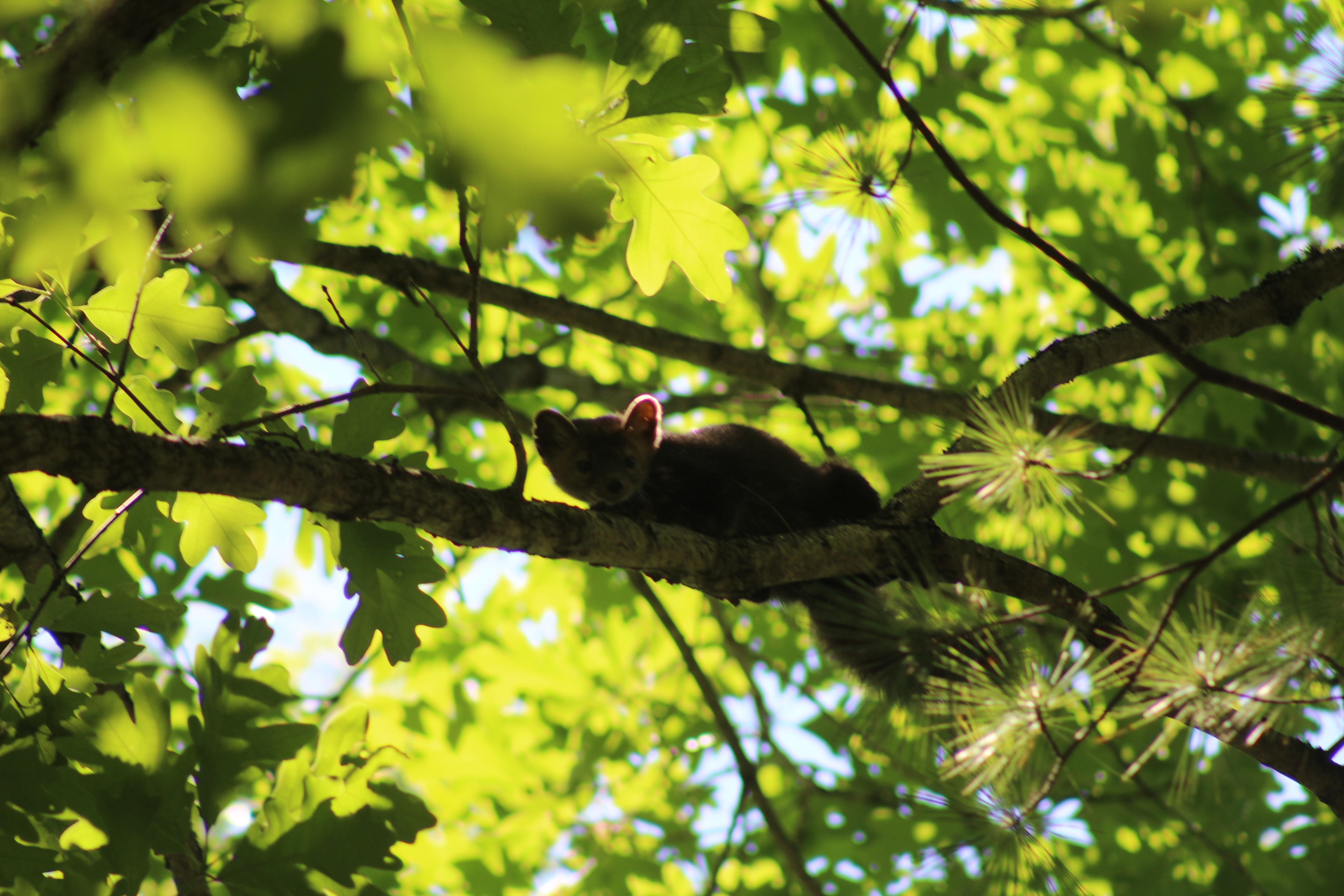 Eastern gray squirrels are about the only other species that might be confused for a marten. In our region, many individuals are melanistic (darker than normal) and this is variable among individuals with some being almost black, to just slightly darker than normal. Eastern gray squirrels weigh 0.75 – 1.5 pounds and are 17 – 20 inches in total length (7 – 10 inches of this is tail). Their tails are much bigger and bushier than marten tails.